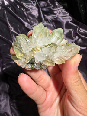 This variation of Epidote Quartz comes from Turkey. Some pieces may have traces of Chlorite in the Quartz as well as the druzy Epidote on top giving it the shimmer and bright green color you see. These are very special clusters and are not commonly found.